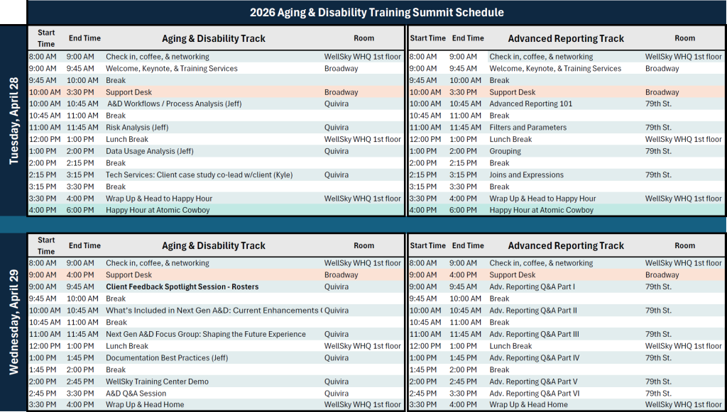 The 2026 A&D Training Summit dates have been solidified! We will be hosting the event both virtually (via Zoom) and at WellSky HQ again this year on Tuesday, April 28th through Wednesday, April 29th from 8am to 4pm Central time.